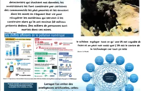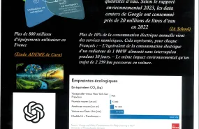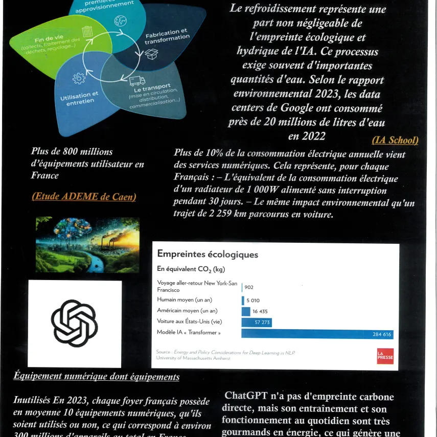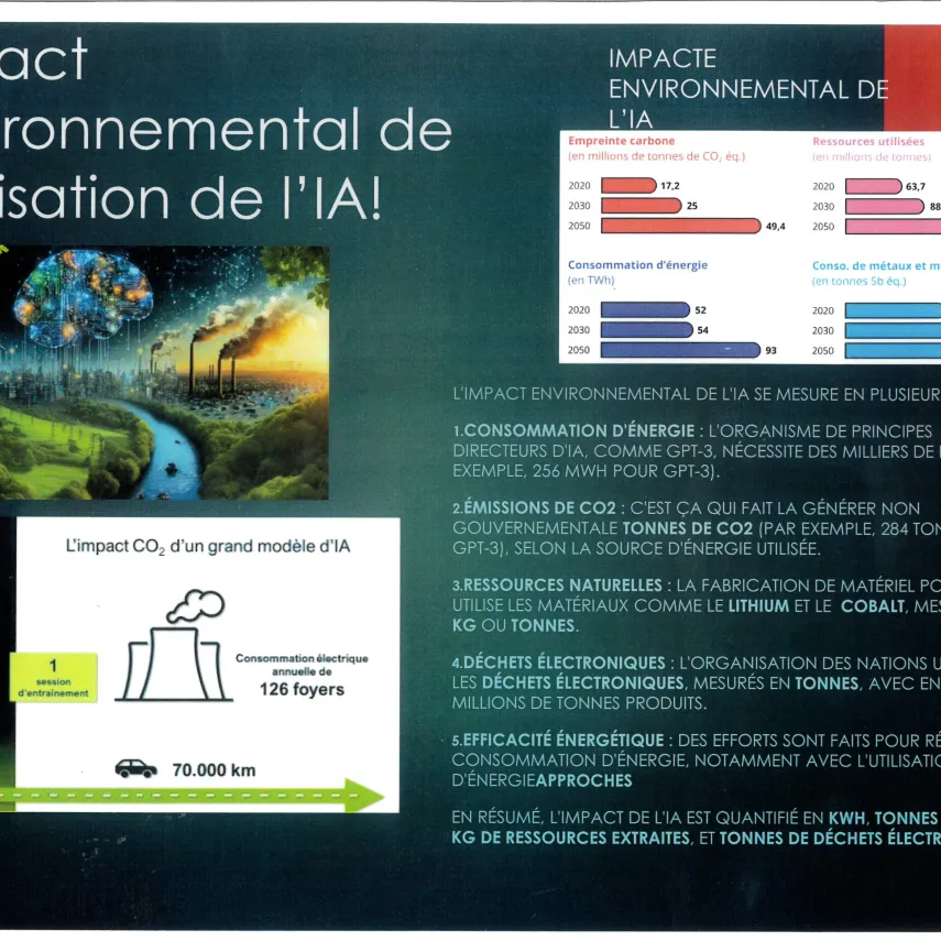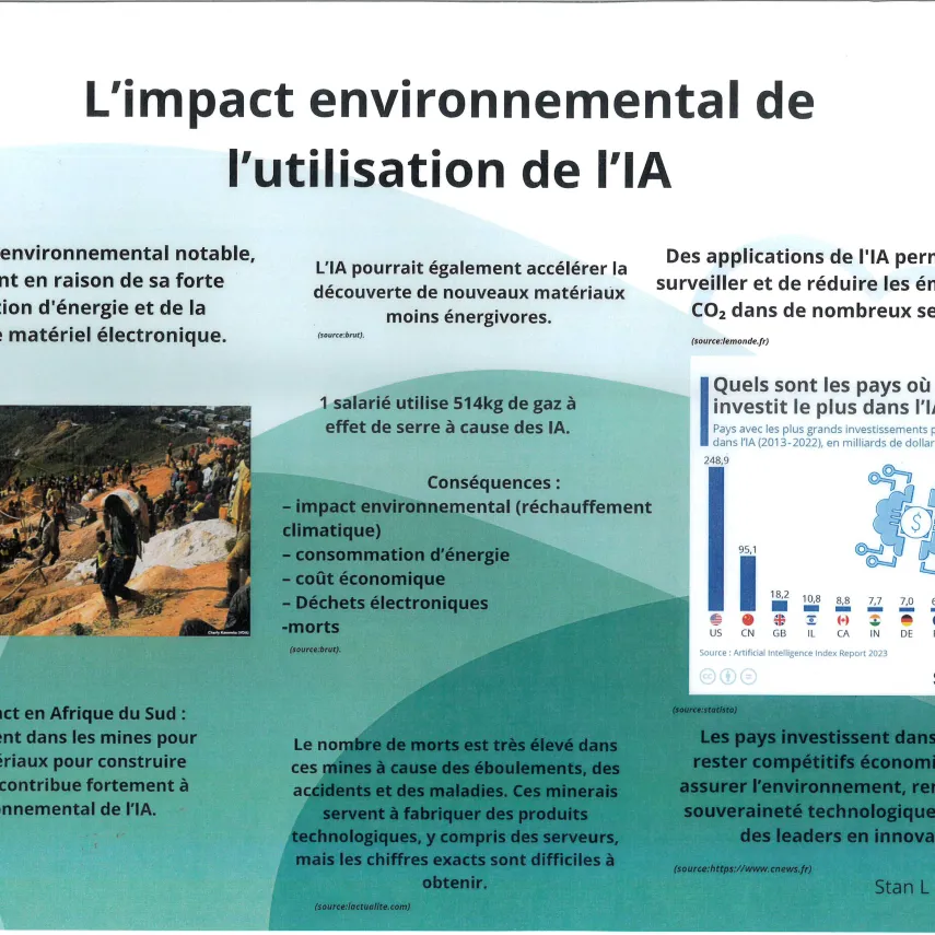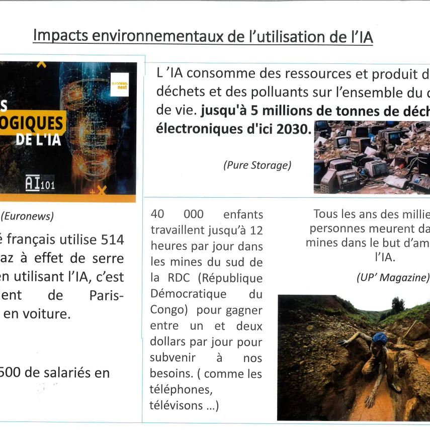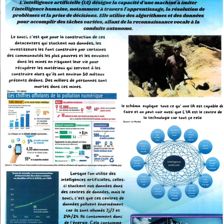 Les élèves se sont mobilisés sur un volume horaire de 8 à 10 heures afin de préparer cette exposition. Les élèves ont d’abord effectué des recherches afin de trouver des liens entre IA et environnement: extraction des matières premières et énergies fossiles, consommation d'eau potable, réchauffement de cette eau, la construction de data centers pour stocker et refroidir les serveurs... Les élèves se sont également posé la question du recyclage de tous les outils numériques..