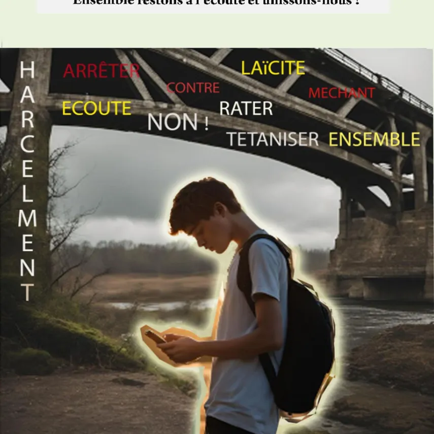 la classe de 2nde ASSP et celle de BTS 1re année ont participé à la création d’affiches de sensibilisation dans le cadre du prix Non Au Harcèlement organisé par le Ministère de l’Education Nationale. La thématique de "l’éducation aux écrans" a également été explorée par certains élèves en parallèle. Pour obtenir le résultat attendu, l’équipe enseignante a initié ses élèves à l’utilisation de l’intelligence artificielle générative. Cette dernière a été employée avec une démarche critique vis à vis de l’outil. Les résultats obtenus ont été retravaillés et suivis d’une réflexion sur l’impact sociétal, notamment en termes de droits d’auteur.